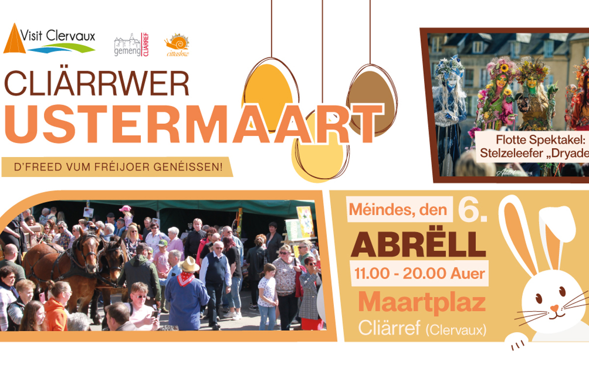 Der traditionelle Ostermarkt in Clervaux lädt Sie am Montag, den 6. April 2026, ab 11:00 Uhr auf den Marktplatz und in die Fußgängerzone ein – zu einem Tag voller Geselligkeit, Genuss und festlicher Stimmung!